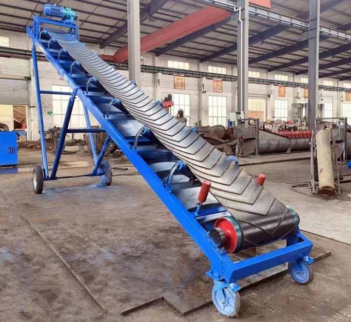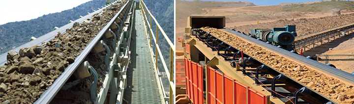 大傾角輸送帶配置了擋邊和隔板。普通帶式輸送機坡度超過18度時,碎石會向下滑落,而大傾角輸送帶的坡度可以達到40度。擋邊防止碎石從皮帶兩側(cè)掉落,隔板在皮帶上形成一個個小格,兜住石子防止下滑。這種類型適用于場地緊張的破碎站,例如在山體上開采時,平地面積不足,只能將輸送機架設(shè)在較陡的坡面上。