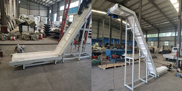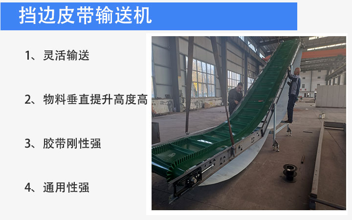 擋邊皮帶輸送機又叫波紋擋邊皮帶輸送機,是在平形橡膠運輸帶兩側粘上可自由伸縮的橡膠波形立式“裙邊”,在裙邊之間又粘有一定強度和彈性的橫隔板組成匣形斗,對物料進行連續(xù)輸送的設備??纱髢A角輸送甚至垂直提升散料。